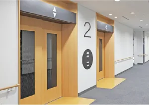 車いすが同時に4台搭乗可能な大きさで、操作盤が左右2箇所に設置され誰でも操作しやすい配置や形状・色となっています。閉じ込め防止の緊急対策としてかご内からの携帯電話通信が可能です。