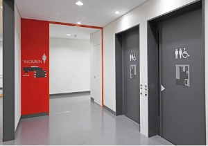 どの階も右側が男性用、左側が女性用で統一しています。照明・床材の切換えで視覚障害のある方に位置情報を提供しています。また、ブースの内と外で配色をかえることで、ドアの開閉状況を分かりやすくなる等多くの工夫をしています。
