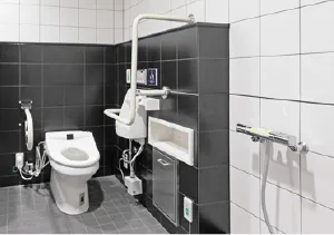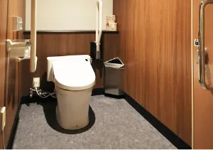 1階に4箇所、2階と4階に2箇所の多目的トイレを設置しています。全ての多目的トイレには簡易ベッドを設置し、1階にはシャワーやオストメイト付きのトイレを設置しています。