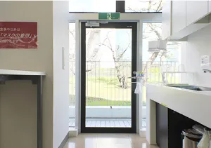 出入りを法定基準数よりも多く設けており、障害のある従業員が多い1階2階ともに避難を容易にしています。