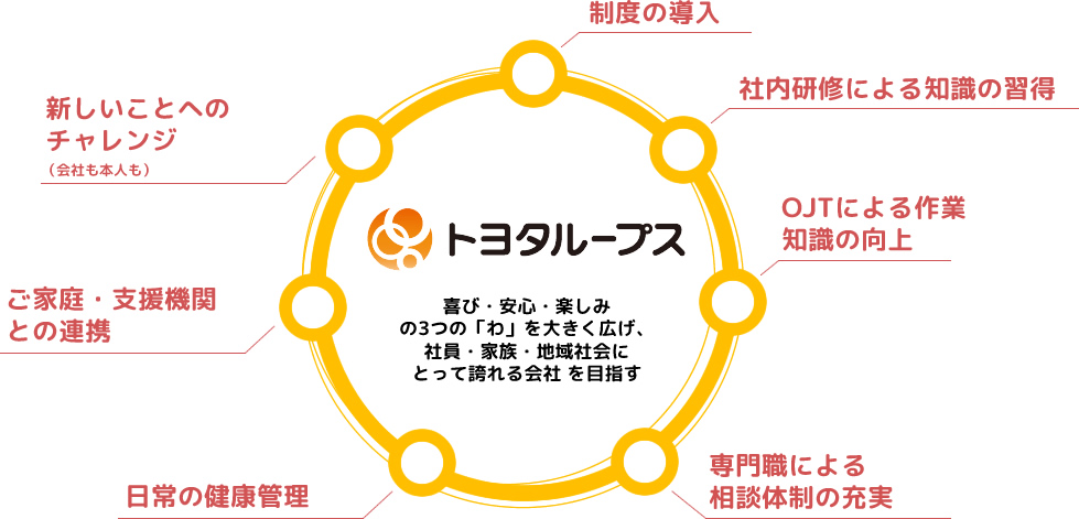 トヨタループスでは、制度・教育・日々のケア・職場と家庭の連携・本人のチャレンジを通して、社員ひとり一人が働きやすい環境を作っています。